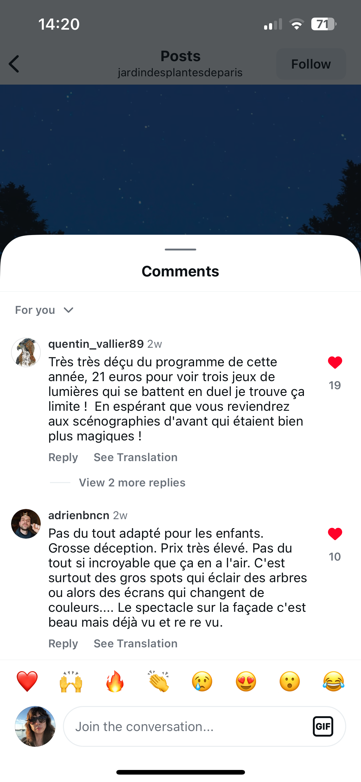 I feel embarrassed and scammed after dragging my family to this, especially because we had my parents with us from out of town. I built it up all week, based on the giant, lighted dinos and insects of previous years. Instead, we were met with a few projections of rocks, some of them broken, more projections of AI animations that my child accurately described as “tele,” and then a ten-minute walk in the dark with absolutely nothing to look at. I don’t know if the budget wasn’t there, if some new hotshot was trying to make a name by “disrupting” the light show landscape, but the result was giving Jardin des Plantes Fyre Festival Edition. My mom rated it 2 out of 10, and comments on the Jardin’s Instagram were enthusiastically panning this year’s “effort.”